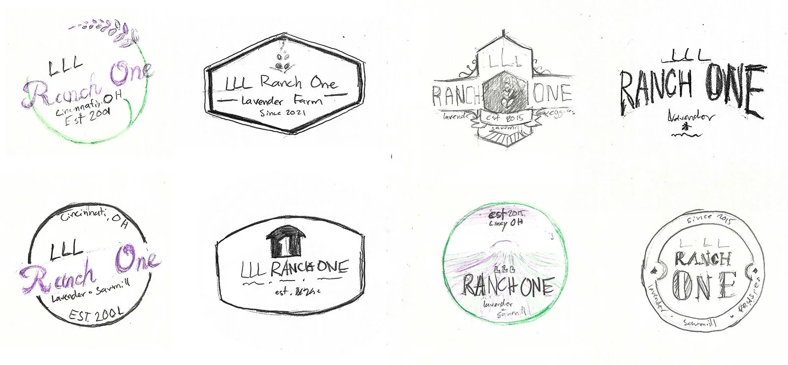 I begin with pencil sketches, striving for conceptual variation. Although the farm was newer, we opted for a badge-like design to communicate heritage, and would communicate the newness through the typographic and shape details.